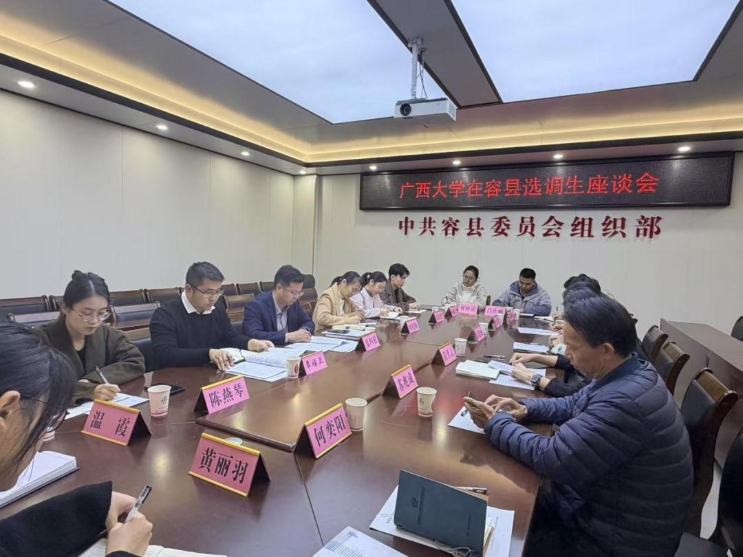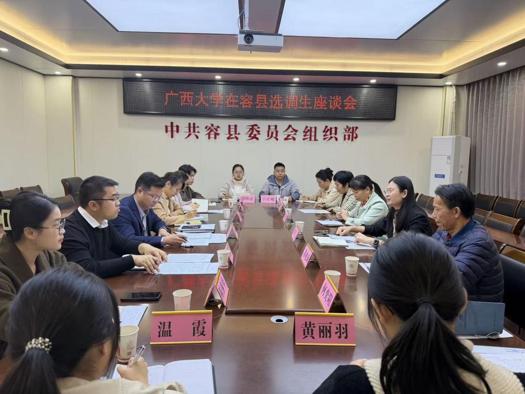 为深入贯彻落实公司党委关于选调生工作的决策部署,持续推进“君武青苗”行动计划,11月26日,公司党委书记黄里云带队赴玉林市容县开展选调生调研交流。容县组织部部长夏四根、副部长覃福正出席座谈会,公司9名在容县工作的选调生代表参加交流。