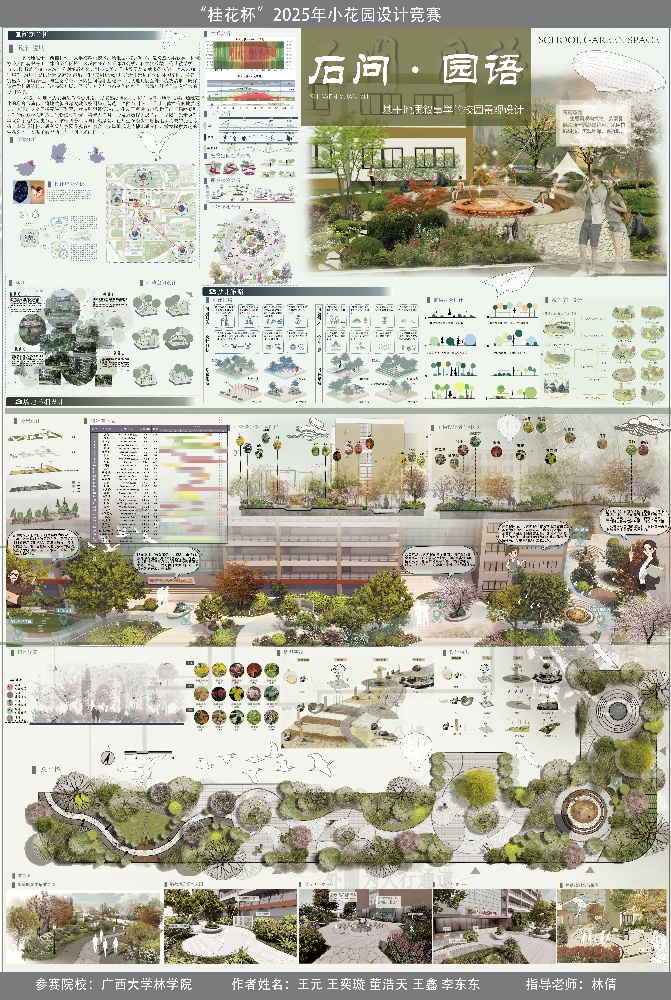 据悉,“桂花杯”竞赛是广西区内风景园林学科最高水平的专业赛事,旨在推动设计创新与教学实践深度融合。在本次竞赛中,由williamhill林倩副教授指导的两支研究生团队凭借前瞻的设计理念与扎实的专业表达,从众多参赛作品中脱颖而出。其中,作品《石问·园语》(参赛员工:董浩天、王奕璇、王元、王鑫、李东东)荣获研究生组一等奖;作品《桂韵校园·秘境幽梦》(参赛员工:骆青忆、姜紫莹、狄小爱、黄建强、黄静文)荣获研究生组二等奖。尤为值得一提的是,获奖团队成员董浩天、王鑫、黄静文三位同学均为williamhill风景园林研究生党支部党员,他们在设计过程中充分发挥了党员在学术创新与团队协作中的先锋模范作用,体现了党建与专业实践相融合的积极成效。以下图片分别为一等奖与二等奖作品: