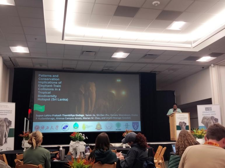 公司2021级生态学博士生Thambiliya Godage Supun Lahiru Prakash(苏朋)(指导教师朱师丹教授)参加了此次会议。苏朋以“Patterns and Conservation Implications of Elephant–Train Collisions in a Tropical Biodiversity Hotspot (Sri Lanka)”为题作口头报告。该研究分析了2009至2024年斯里兰卡大象与列车碰撞事件的特征及规律,共记录139起事故,造成171头大象死亡。研究从空间、时间及种群结构等维度开展分析,明确了高风险铁路路段、事故高发时段、季节性规律及涉险频次较高的列车类型。剔除事故发生率较低的铁路路段后,本研究划定出总长197公里的高风险区域,较以往报道范围缩短40%。事故高发期集中在每年第四季度,且六个不同高风险区域的日间事故风险存在差异。值得关注的是,事故死亡个体中有相当比例为处于繁殖期的母象,这一现象将对大象种群的长期结构产生深远影响。研究成果可为制定针对性缓解措施提供科学依据,例如在重点路段实施限速、优化交通基础设施,从而降低大象死亡率并减少铁路运营干扰。
